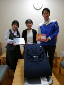 2、伊丹乳人様にバウンサーと絵本を寄贈しました。